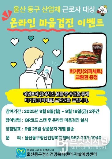 브릿지저널 윤나영 기자 | 울산동구정신건강복지센터(센터장 전진용)는 자살예방의 날(9월 10일)을 기념하여 9월 8일부터 2주간 동구 관내 산업체 근로자 100명을 대상으로 온라인 조기 검진 이벤트를 운영한다.