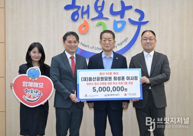 브릿지저널 윤나영 기자 | (재)울산공원묘원 최성훈 이사장은 8일 남구청을 방문해 지역 어르신들의 정서적 건강 증진을 위한 이웃돕기 성금 500만 원을 전달했다.