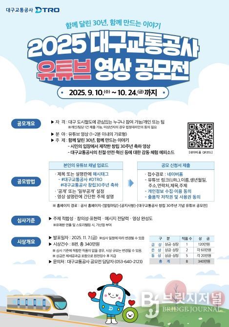 브릿지저널 김진석 기자 | 대구교통공사는 창립 30주년을 기념해 ‘대구교통공사 유튜브 영상 공모전’을 개최한다.