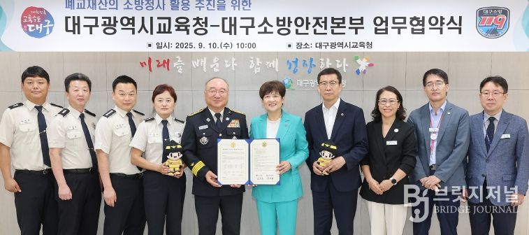 브릿지저널 김진석 기자 | 대구시교육청은 대구소방안전본부와 9월 10일 오전 10시 시교육청 접견실에서 2025년 3월 1일 자로 폐교된 서변초 조야분교에 119특수구조대 청사 이전 추진을 위한 업무 협약을 체결했다.