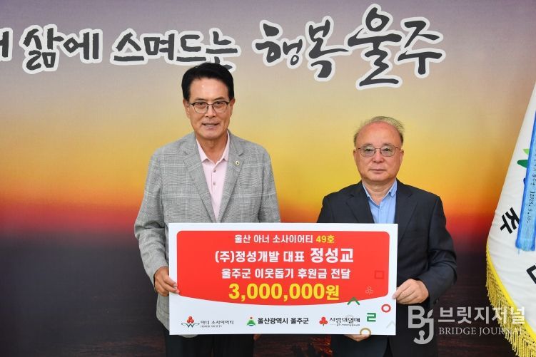 브릿지저널 윤나영 기자 | ㈜정성개발(대표 정성교)가 11일 울주군청 소회의실에서 이순걸 군수와 정성교 대표 등이 참석한 가운데 울주군 저소득 세대를 돕기 위한 성금 300만원을 전달했다.