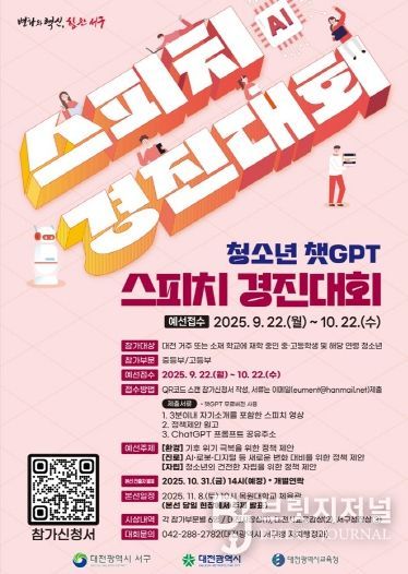 브릿지저널 정보영 기자 | 대전 서구는 청소년 창의 사고력과 디지털 역량 강화를 위해 11월 8일 열리는 ‘청소년 챗GPT 스피치 경진대회’ 예선 참가자를 모집한다고 12일 밝혔다.