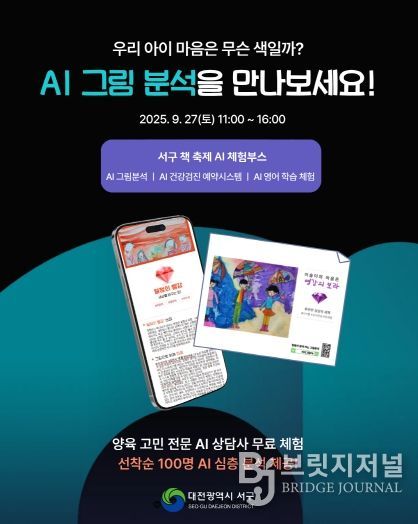 브릿지저널 정보영 기자 | 대전 서구는 오는 9월 27일 갈마문화공원(월평도서관 옆)에서 열리는 ‘서구 책 축제’ 기간 동안 AI 체험 부스를 운영한다고 12일 밝혔다.