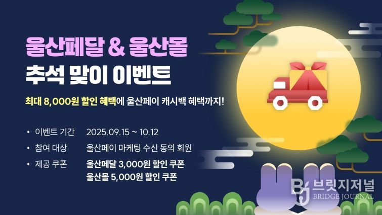 브릿지저널 윤나영 기자 | 울산시는 추석 명절을 맞아 오는 9월 15일부터 10월 12일까지 ‘2025 울산페달·울산몰 추석 할인쿠폰전’을 진행한다고 밝혔다.