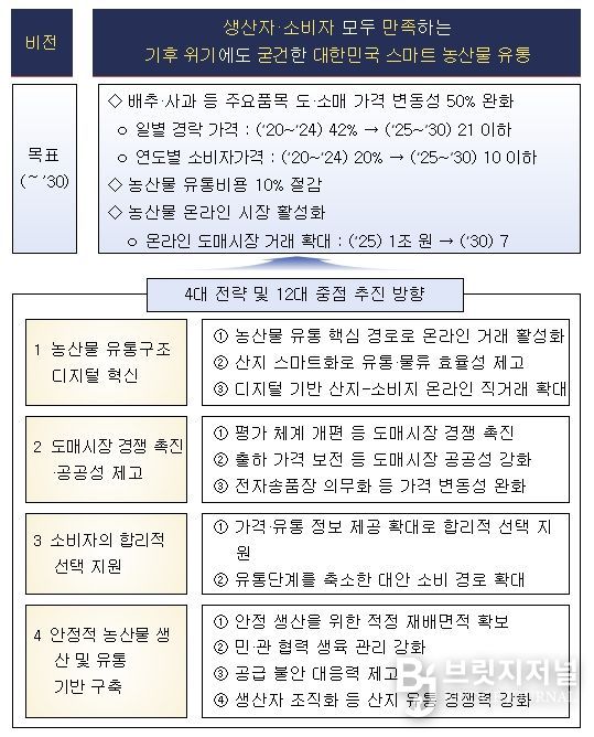 농식품부는 이에 대응해 현재의 유통구조를 생산자와 소비자 모두 만족하고, 기후 위기에도 안정적인 디지털 기반 스마트 농산물 유통구조로 대전환하여 가격을 안정화하고 유통 비효율을 해소할 계획이다. 주요 목표는 배추·사과 등 핵심 품목의 가격 변동성 50% 완화와 유통비용 10% 절감이며 이를 위해 4대 전략과 12개 과제를 중점 추진한다.