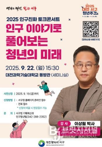 브릿지저널 정보영 기자 | 대전 서구는 오는 22일 대전과학기술대학교 동방관(세미나실)에서 ‘2025 인구 친화 토크콘서트’를 개최한다고 16일 밝혔다.