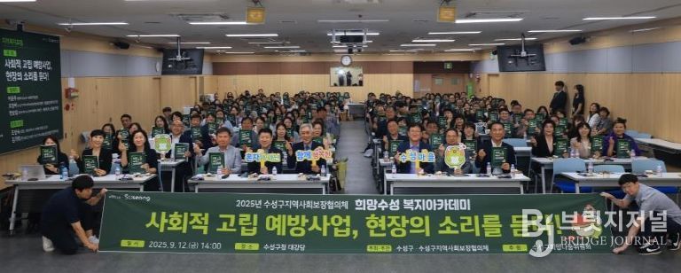 브릿지저널 김진석 기자 | 대구 수성구는 지난 12일 수성구청 대강당에서 협의체 위원, 사회복지기관 및 시설 종사자, 지역 주민 등 200여 명이 참여한 가운데 ‘사회적 고립 예방사업, 현장의 소리를 듣다!’를 주제로 수성구지역사회보장협의체 2025년 '희망수성 복지아카데미'를 성황리에 개최했다.