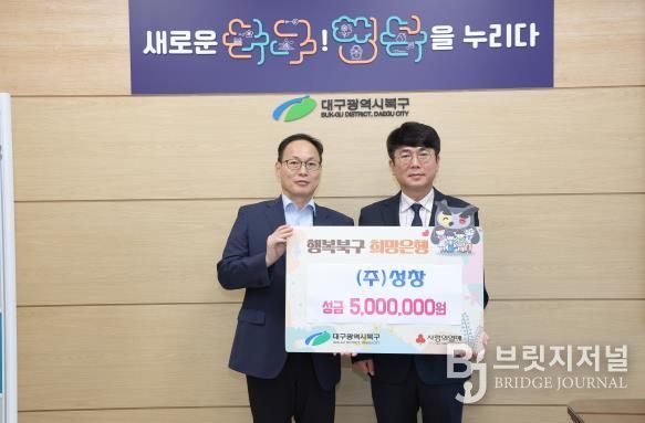 브릿지저널 김진석 기자 | (주)성창에서는 9월 16일 북구 저소득층 지원을 위한 성금 500만원을 대구 북구청에 기탁했다.