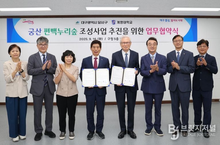 브릿지저널 김진석 기자 | 대구 달서구는 16일 구청 5층 회의실에서 계명대학교(총장 신일희)와 ‘궁산 편백누리숲 조성’을 위한 업무협약(MOU)을 체결했다.