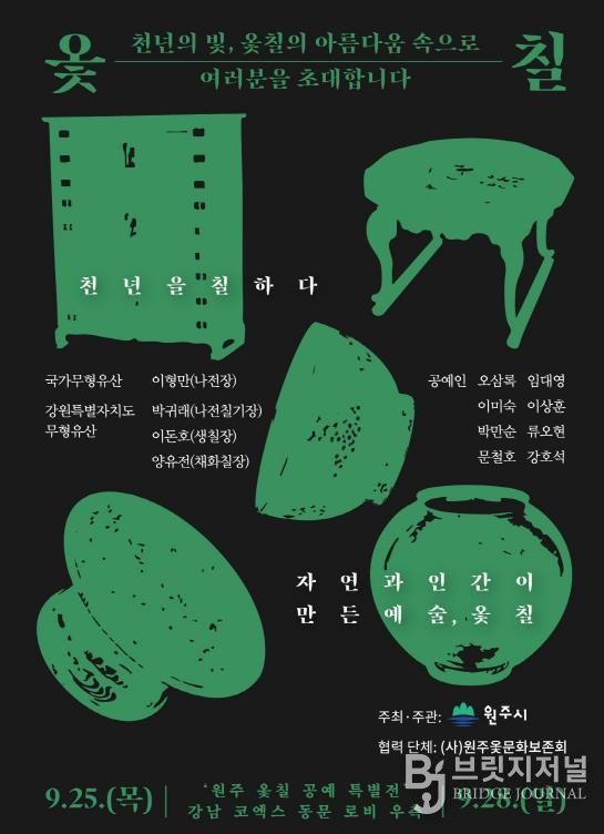 브릿지저널 윤나영 기자 | 원주시는 오는 25일부터 28일까지 4일간 서울 코엑스 동문 로비에서 ‘원주 옻칠 공예 특별 전시회’를 개최한다.