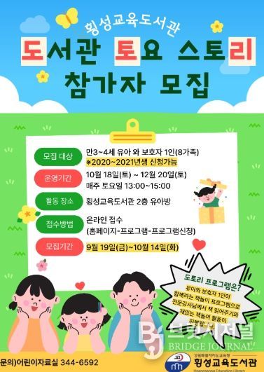 브릿지저널 윤나영 기자 | 횡성교육도서관은 10월 18일부터 12월 20일까지 10회에 걸쳐 ‘유아 책 놀이 프로그램인 도토리(도서관 토요 스토리)’를 운영한다고 밝혔다.
