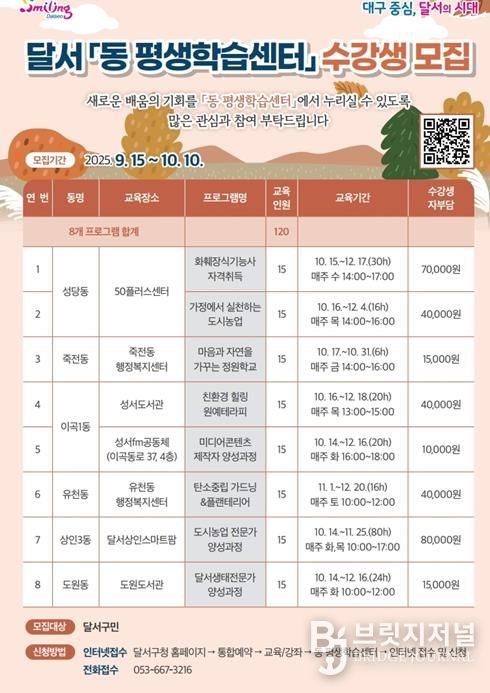 브릿지저널 김진석 기자 | 대구 달서구는 주민 누구나 집 가까운 곳에서 쉽고 편리하게 배움에 참여할 수 있는 ‘동네학습관’ 수강생을 모집한다고 밝혔다.