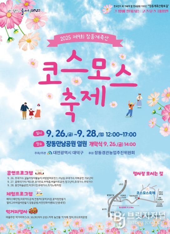 브릿지저널 정보영 기자 | 대전 대덕구는 오는 9월 26~28일 사흘간 장동만남공원 일원에서 ‘도심 속 가을의 낭만’을 주제로 ‘제9회 장동계족산 코스모스축제’를 개최한다고 19일 밝혔다.