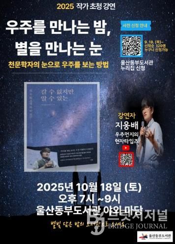 브릿지저널 윤나영 기자 | 울산 동부도서관은 오는 10월 18일 오후 7시 야외 잔디마당에서 천문학자이자 유튜브 1인 방송 진행자(크리에이터) 지웅배 작가의 초청 강연 ‘우주를 만나는 밤, 별을 만나는 눈’을 연다.