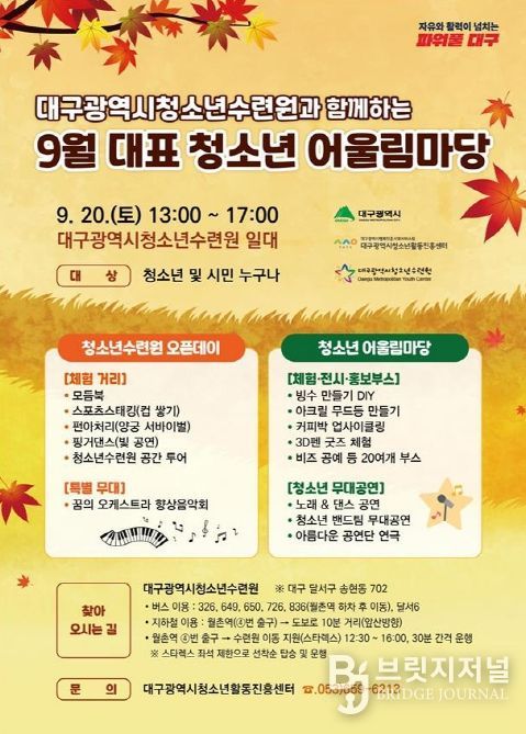 브릿지저널 김진석 기자 | 대구광역시는 9월 20일 오후 1시, 청소년수련원에서 ‘청소년 어울림마당’ 연 5회 행사 중 세 번째로 열리는 특별한 ‘오픈데이’를 개최한다.