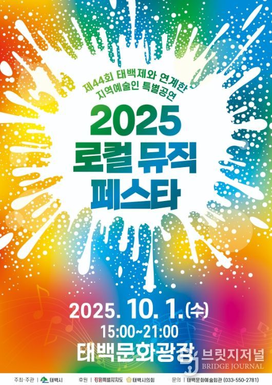 브릿지저널 윤나영 기자 | 태백시는 제44회 태백제와 연계한 지역예술인 특별공연 '2025 로컬 뮤직 페스타'를 오는 10월 1일 오후 3시부터 9시까지 태백문화광장에서 개최한다고 밝혔다.