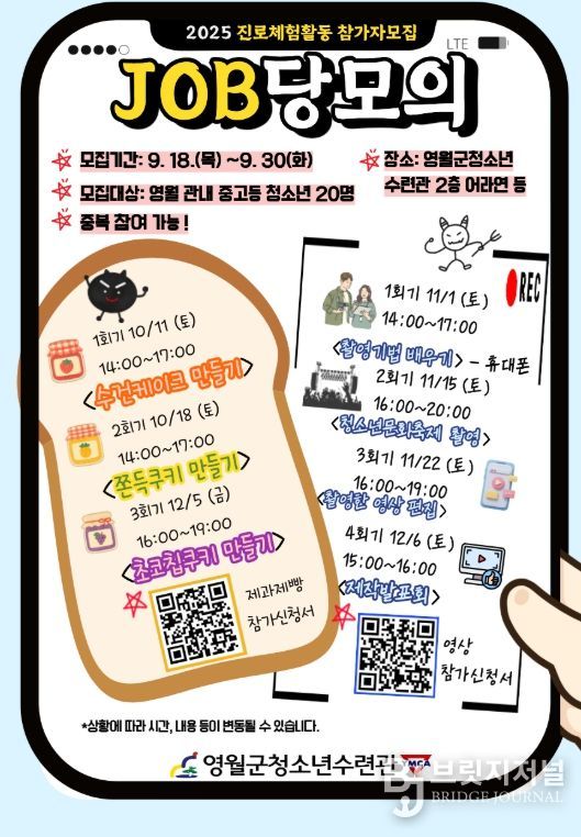브릿지저널 윤나영 기자 | 영월군청소년수련관은 9월 18일~9월 30일까지 '2025년 진로체험활동 “JOB당모의”' 참가자를 모집한다.