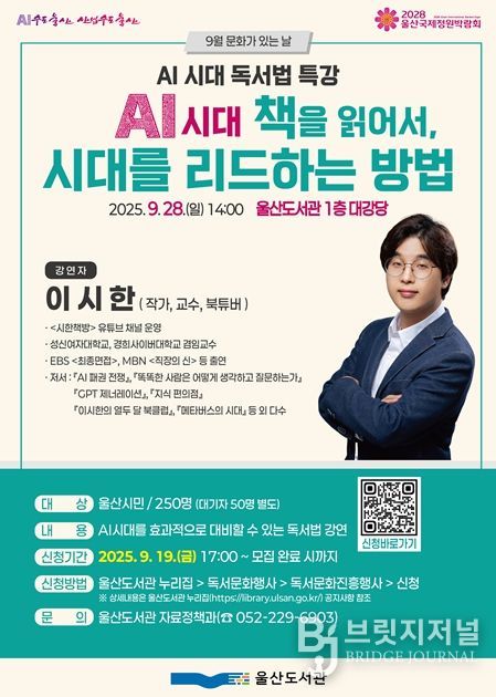 브릿지저널 윤나영 기자 | 울산도서관은 9월 문화가 있는 날을 맞아 오는 9월 27일 작은 음악회 ‘빛나는 시작, 우리의 노래’를, 9월 28일 이시한 작가의 ‘인공지능(AI) 시대 책을 읽어서, 시대를 이끄는(리드하는) 방법’ 특강을 양일간 개최한다고 밝혔다.
