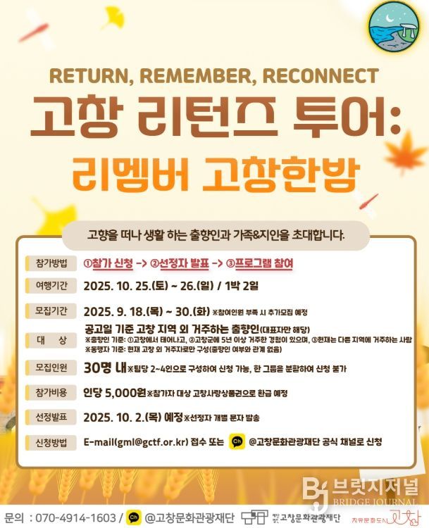 브릿지저널 윤나영 기자 | 고창문화관광재단이 오는 10월25~26일(1박2일) 출향인 초청 팸투어 ‘고창 리턴즈 투어: 리멤버 고창한밤’을 운영한다.