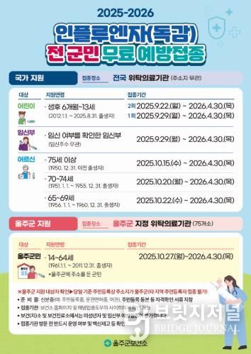 브릿지저널 윤나영 기자 | 울산 울주군이 오는 22일부터 내년 4월 30일까지 인플루엔자 무료 예방접종을 실시한다고 19일 밝혔다.
