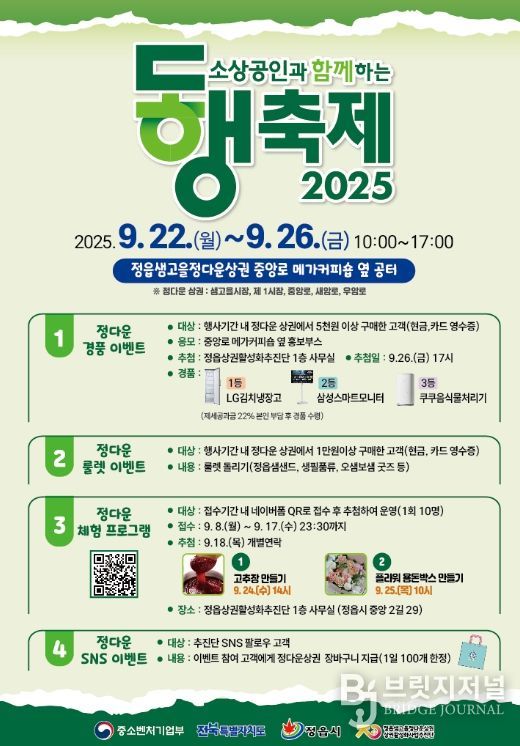 브릿지저널 윤나영 기자 | 정읍시가 지역 상권 활성화를 위해 오는 22일부터 26일까지 ‘2025 정다운 할인 동행축제’를 정다운 상권 일원에서 개최한다.
