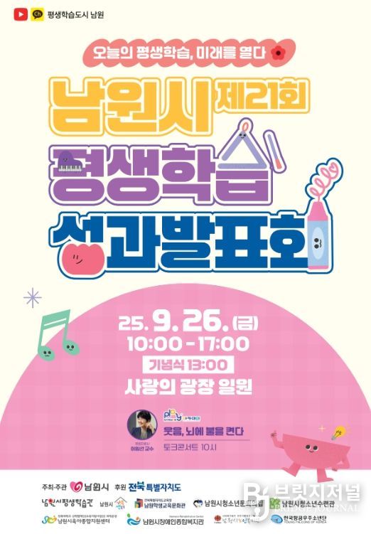 브릿지저널 윤나영 기자 | 남원시은 오는 26일 사랑의 광장에서 ‘오늘의 평생학습, 미래를 열다’를 주제로 제21회 남원시 평생학습 성과발표회를 개최한다.
