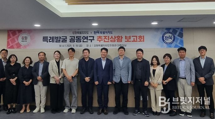 브릿지저널 윤나영 기자 | 강원특별자치도는 9월 19일 오전 10시 강원특별자치도민회관 대회의실에서 전북특별자치도와 함께 '특례 발굴 공동연구 추진상황 보고회'를 개최했다고 밝혔다.