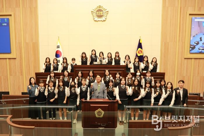 브릿지저널 김경미 기자 | 충북도의회는 19일 충주 예성여중 학생 34명이 참여한 가운데 본회의장에서 제123회 청소년 의회교실을 운영했다.