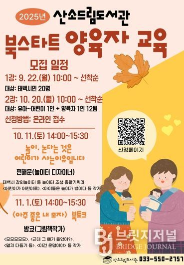 브릿지저널 윤나영 기자 | 태백시는 산소드림도서관에서 북스타트 사업을 알리고 올바른 독서교육 방향을 제시하기 위해 “2025년 북스타트 양육자 교육”을 다음과 같이 운영한다고 밝혔다.