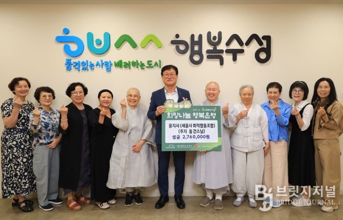 브릿지저널 김진석 기자 | 대구 수성구는 지난 19일 용지사(세음사회적협동조합) 주지 동건스님과 신도들이 재난 피해 주민들을 위해 써달라며 성금 276만 원을 전달했다고 밝혔다.