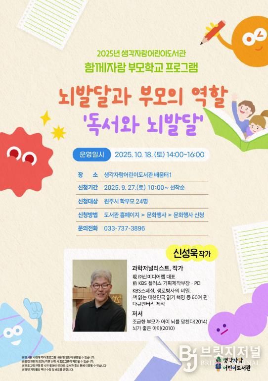 브릿지저널 윤나영 기자 | 원주시 생각자람어린이도서관은 다음 달 18일 신성욱 작가를 초청해 ‘뇌발달과 부모의 역할-독서와 뇌발달’을 주제로 ‘함께자람 부모학교’ 프로그램을 운영한다.