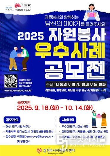 브릿지저널 윤나영 기자 | 사단법인 전주시자원봉사센터는 오는 10월 14일까지 전주시민들을 대상으로 ‘2025년 자원봉사 우수사례 공모전’을 개최한다.