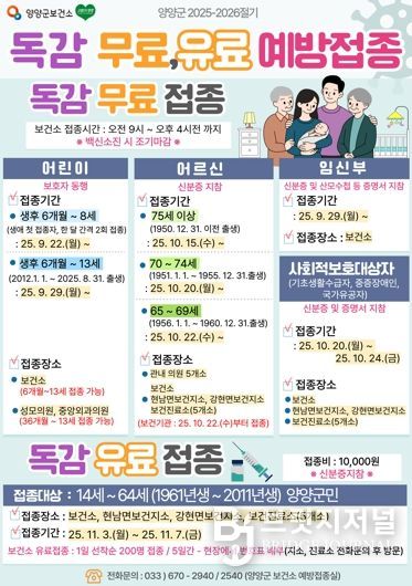 브릿지저널 윤나영 기자 | 양양군이 2025년 9월 22일부터 어린이를 시작으로 임신부, 어르신 대상 인플루엔자 무료 예방접종을 실시한다.