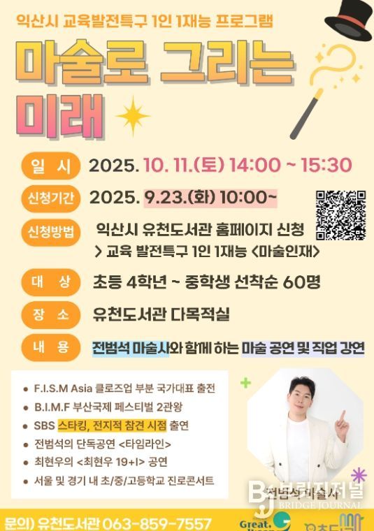 브릿지저널 윤나영 기자 | 익산시는 유천도서관에서 오는 10월 11일 마술사 전범석과 함께하는 '마술로 그리는 미래' 프로그램을 진행한다고 22일 밝혔다.