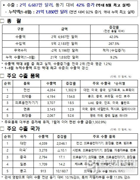 올해 1~8월 누적 수출액은 21억 1,850만 달러로 집계되어 역대 최고치를 경신했다.