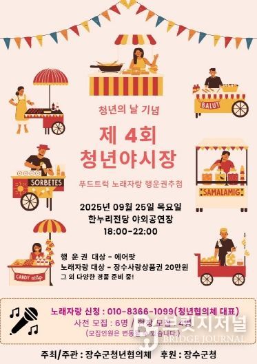 브릿지저널 윤나영 기자 | 장수군은 오는 25일 오후 6시부터 장수한누리전당 야외공연장에서 ‘제4회 청년의 날 기념 장수 청년 야시장’을 개최한다고 밝혔다.