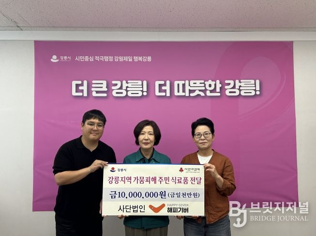 브릿지저널 윤나영 기자 | (사)해피기버(이사장 권태일)는 22일 강릉시에 1천만 원 상당의 즉석식품을 전달하며 강릉지역 가뭄 피해 주민 돕기에 나섰다.