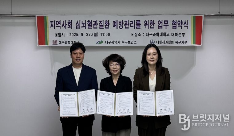 브릿지저널 김진석 기자 | 대구광역시 북구보건소와 대구과학대학교, 대한제과협회 대구경북지부 북구지회는 9월 22일(월) 대구과학대학교 대학본부에서 지역사회 심뇌혈관질환 예방관리 협력체계 구축을 위한 업무협약을 체결했다.