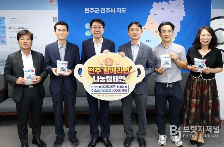 브릿지저널 윤나영 기자 | 현대차동차 전주공장(공장장 장현구)은 22일 전주시장실을 찾아 전주시가 중점 추진 중인 ‘전주함께라면’ 복지사업에 힘을 보태기 위해 수소전기라면 3000개를 전달했다.