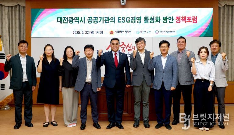 브릿지저널 정보영 기자 | 대전시의회 산업건설위원회는 김영삼 부의장(국민의힘, 서구2)을 좌장으로 22일 시의회 3층 소통실에서 「대전광역시 공공기관의 ESG경영 활성화 방안 정책포럼」을 개최했다.