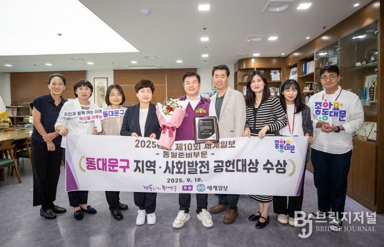 브릿지저널 김경미 기자 | 서울 동대문구는 ‘통일준비 도시’의 모범사례로 인정받았다. 구는 지난 18일 열린'제10회 세계일보 지역·사회발전 공헌대상'시상식에서 ‘통일준비 부문’ 수상의 영예를 안았다. 이번 수상은 전국 기초자치단체 가운데 유일한 통일 분야 수상 사례다.