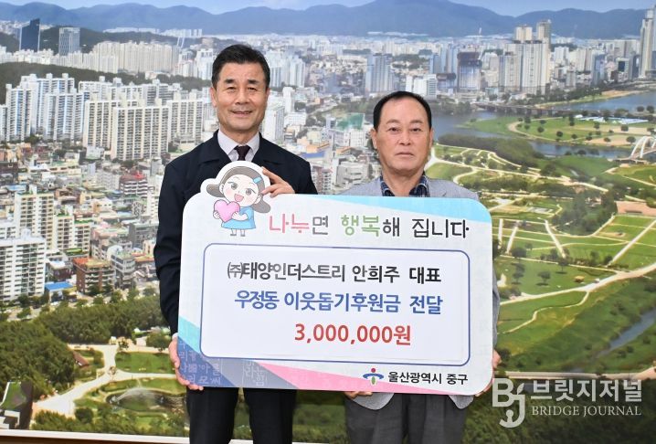 브릿지저널 윤나영 기자 | 안희주 ㈜태양인더스트리 대표가 9월 22일 오후 4시 30분 중구청 구청장실을 찾아 대한적십자사 울산광역시지사를 통해 이웃돕기 후원금 300만 원을 전달했다.