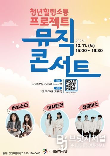 브릿지저널 윤나영 기자 | 고래문화재단(이사장 서동욱)은 청년층을 위한 위로·힐링 공연 ‘뮤직 콘서트’를 장생포문화창고 소극장W(6층)에서 오는 10월 11일 오후 3시에 개최한다.