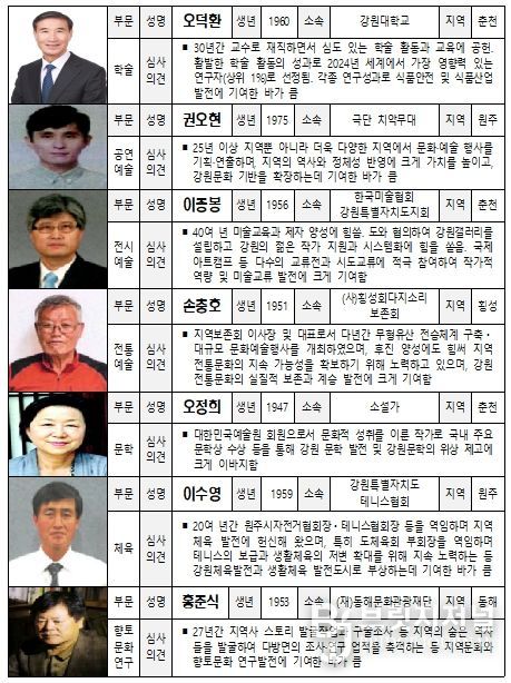 브릿지저널 윤나영 기자 | 강원특별자치도는 강원문화 발전과 향토문화 보존·증진에 기여한 유공자를 시상하기 위해 '제67회 강원특별자치도 문화상 심사위원회'를 개최하고, 7개 부문 7명의 수상자를 최종 확정했다고 밝혔다.
