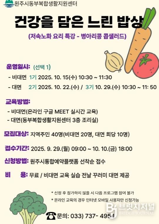 브릿지저널 윤나영 기자 | 원주시동부복합생활지원센터는 오는 29일부터 저속노화 요리 특강 ‘건강을 담은 느린 밥상’ 프로그램 참여자를 모집한다.