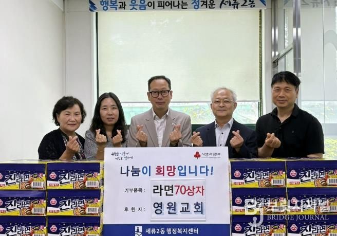 브릿지저널 김경미 기자 | 수원시 권선구 세류동 소재 수원영원교회는 지난 22일, 추석 명절을 맞이하여 취약계층을 위한 라면 70박스를 세류2동 행정복지센터에 기부했다.