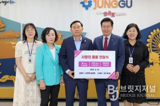 브릿지저널 김진석 기자 | 대구 중구는 사단법인 한국나눔연맹(대표 안지애)가 지난 22일 대구 중구청을 방문해 추석 명절을 맞아 백미(10kg) 1,000포, 라면(12개입) 1,000박스, 간식(쌀과자 50봉) 1,000박스 등 이웃돕기 성품을 기탁했다고 밝혔다.