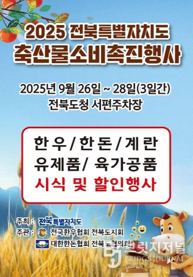 브릿지저널 윤나영 기자 | 전북특별자치도가 추석 명절을 맞아 도민들에게 안전하고 품질 좋은 축산물을 저렴하게 제공하기 위해 ‘2025년 축산물 소비촉진행사’를 연다. 도는 이번 행사를 9월 26일부터 28일까지 사흘간 도청 서편광장에서 개최한다고 23일 밝혔다.