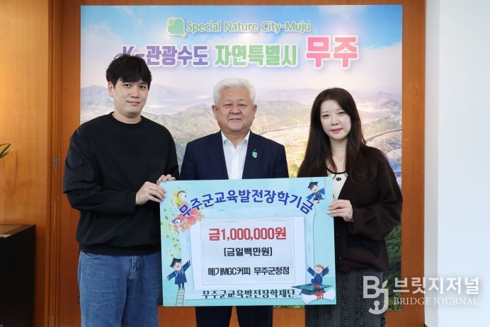 브릿지저널 윤나영 기자 | 메가MGC커피 무주군청점에서 지난 23일 (재)무주군교육발전장학재단(이사장 황인홍 무주군수)에 장학금 1백만 원을 기탁했다.
