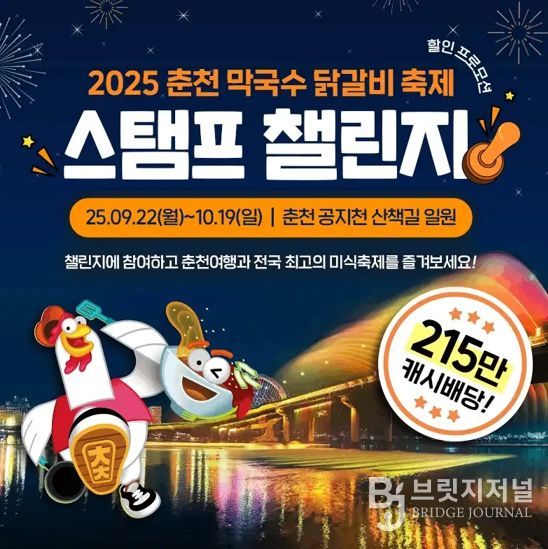 브릿지저널 윤나영 기자 | 춘천의 대표 미식 축제인 2025 춘천막국수닭갈비축제가 사전 운영 프로그램으로 선보인 ‘스탬프 챌린지’ 프로그램이 공개 하루 만에 참여자가 약 1만 명을 돌파하며 큰 호응을 얻고 있다.